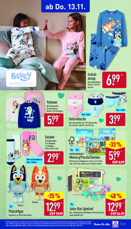 Bitte beachten Sie, dass dieser Text automatisch generiert wird und möglicherweise Fehler enthältab Do. 13.11. *. A one 3 7 # 2 WS 4 A cl en N Fe Ws 14 NV, A LE A à FA, — ‘à Schlaf- LI 00 k anzug Reine Baumwolle; 98/104-122/128; ST ae Garnitur ÿ fe) fr Pullover 80% Baumwolle, # 20% Polyester; 98/104-122/128; Stück 5 J 32 Unterwäsche 1 si Reine Baumwolle bzw. 95% Baumwolle, u 5% Elasthan; 98/104-122/128; Set EE 2] Socken © 78 % Baumwolle, 7 À 2 21% Polyamid, LS FSC ie 1% Elasthan; Mix 23/26-31/34; 2 Paar 3e Se RAVENSBURGER mt ‘à je Memory/Puzzle/ Domino { 299 Memory mit 24 Bildpaaren; Puzzle, 2x12 Teile, ‚oder 3x49 Teile, Domino mit 32 Karten; Stück Gan v h. À v | 1% } N) |, N N | Y ar Bingo 15] Bluey 9° | Eu 299 Juice-Bar-Spielset 172 Plüschfigur Inkl.2beweglicher Spielfiguren, Blueÿ und Coco, Polyester; ca.30cm hoch; Stück ‚sowie Zubehör; Set stehen urn AL nnen BRAC EHEN ut Lier En D Mon 1 Studi PlyLmitedandar oral and su tre TTC DT] CEE 21 tee]