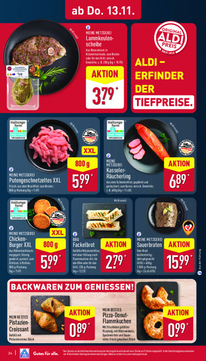 Bitte beachten Sie, dass dieser Text automatisch generiert wird und möglicherweise Fehler enthältab Do. 13.11. 6 % MEINE METZGEREI Lammkeulen- à Ÿ CL 1F ‚Aus Neuseeland; in Kräutermarinade; zum Braten BIT oder für den Grill; versch. | | Gewichte: z. B. 200 g (kg = 18.98) ALDI - / ERFINDER 1 se BA T IEFPREIS Haltungs- Haltungs- form 2 form KA un Zen ua Zen % SU “ altungstorn.e atungslomde ON EN = TERRA Rn he R = U 27 S ED À LENS 800g METZGEREI Kasseler- MEINE METZGEREI Räucherling TGE ARD ONE LA Aus dem Schweinefilet: gepäkelt und Frisch; aus dem Brustfilet; zum Braten; geräuchert; zum Garen; versch. Gewichte 687 B00-9-Packung kg =7.49) PONT EE) Haltungs- AE —— LINE form % mn Sen wen ge Wz À KS malungsormde E EN == ( 3% MEINE METZGEREI box Chicken- BBQ MEINE METZGEREI Sauerbraten Burger XXL Fackelbrot ‚Aus Hähnchenfleisch; Gefüllte Weizentortillas; ra Vom Rind; Laon vorgegart: üssig DETTE küchenfertig: gewürzt; paniert; zum Flammkuchen-Art; für Abtropfgewicht Erhitzen; 6 Patties; CEE CAT EU RTS 99° 800-g-Packung 597 pe EN ILE OTE A B (kg = 749) (kq =1213) LE .65 AT) Ce MEIN BESTES AKTION AKTION MEIN BESTES Pizza-Donut- Flammkuchen Pistazien- = L Croissant Mit Frischkäse gefüllter Gefüllt mit 89 Pizzateig; mit Röstzwiebeln, 99 Pistazienereme; Stück Speckwürfeln und Sauer- rahm; frisch gebacken;Stück "Das Syst zureineitüchen Kennzeichnung der Haltungsforn wid aktuellvond Stufen auf Stufen umgestellt In der Unstelungsphaseverkaufen wir Artikel beide Haltungsformkennzeichnungen. Näheres erfährst du unterhaltungsform.de. Zu A een