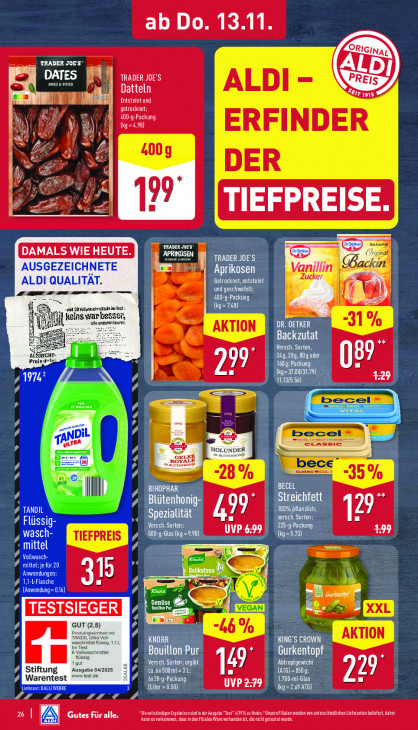 Bitte beachten Sie, dass dieser Text automatisch generiert wird und möglicherweise Fehler enthältab Do 13.11 LUS DAT = TRADER JOE'S DI CET ALDI - Datteln TES EL: Entsteint und getrocknet; | (kg=4.98) NEE KR Al ERFINDER [| 5 400g DER | IR er 4 99 TIEFPREISE Ee koe [DAMALS WIE HEUTE.) KLUS) AUSGEZEICHNETE u I Vanillin Backin Aprikosen Zucker ALDI QUALITÄT. Getracknet, entsteint D me mm — PRA und geschwefelt ten) 17 à. mit 20Yolwasehmülten im Ist ns war bes Ë jj al rentes DR. OETKER 3 1% Backzutat E23 Versch. Sorten, Prei 99 ENEN en 89 CARTER RT 11.13/5.56) ae becel- AS Se NDiL becel= e n LTRA HOLUND erassie ROYAL GELE] bece 8% tassıc wi. 3 5% BECEL | (fl LATE CET SALE ZA Spezialität 99 LUE 100% pflanzlich # Flüssig Versch. Sorten: DE) 129 wasch 500-9-6las (kg=9.98) UVP 6-99 (la=573) 7 Ru 0 L= =| ATD (2! een Anwendungen; I # 11-LFlasche TE / (Anwendung = 0.6) e, = B d Gemüse ra éd: LTESTSIEGER ie GUT (2,5) “46% at KNORR USER UT EH ss! Bouillon Pur Gurkentopf Ausgabe 04/2025 tout ca.6x500ml= 3 L: Tr 49 Abtropigewicht Stiftung Warentest test.de ES Ate TT AT 1.700-mt-Glas 229 LS RSS SN Vz DALLIWERKE (Liter =0.50) PVEN NL red CEE) VII LD LAD. COLE EN DE LT De eeN tene CIN 26 BA) A] Gutes für alle. kann esvorkommen, dass inden Fllen Ware vorhanden st, ie nicht getestet wurde.