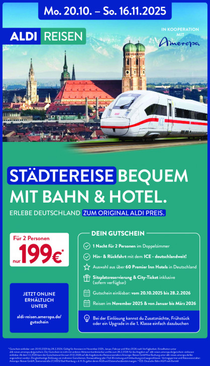 Bitte beachten Sie, dass dieser Text automatisch generiert wird und möglicherweise Fehler enthältMo. 20.10. — So. 16.11.2025 Fo PE our u IN KOO a MEN % an 4 a ! Fan 1.1 I | il il r er il E ii met = S | ins ur = N Nar, 5 S AE ER er Zr Az gg STÄDTEREISE BEQUEM MIT BAHN & HOTEL. ERLEBE DEUTSCHLAND! ZUM ORIGINAL ALDI PREIS. DEIN GUTSCHEIN © 1Nacht für 2 Personen im Doppelzimmer ©) Hin- & Rückfahrt mit dem ICE - deutschlandweit! %7 Auswahl aus über 60 Premier Inn Hotels in Deutschland Sitzplatzreservierung & City-Ticket inklusive (sofern verfügbar) JETZT ONLINE Gutschein einlösbar: vom 20.10.2025 bis 28.2.2026 ERHÄLTLICH Reisen im November 2025 & von Januar bis März 2026 ONU EIREEUER SSERER) © Bei der Einlösung kannst du Zusatznächte, Frühstück EME] oder ein Upgrade in die 1. Klasse einfach dazubuchen Gutschein einlösbar vom 20.10.2025 bis 28.2.2026. Gükig für Anreisen im November 2025, Januar, Februar und März 2026 nach Verfügbarkeit. Ne einlösbar. Ab dem 1.3.2026 kann der Gutscheinvert biszum 3112.2028 aufalle Angebatedes Reiseveranstalters Ameropa-Reisen GmbH bei Buchung unter ali risen.ameropa.de/ibe aldı eisen.ameropa.de/gutschein. Der Gutschein ist nicht mit anderen Aktionen kombinierbar und biszum 28.2.2026 fürdas Angebot auf akl-reisen.ameropa.delgutschein-einkesen angerechnet werden. Die gleichzeitige Einlösung von mehreren Gutscheinen, Barauszahlung oder (ei JErstattungund Umbuchungsind ausgeschlossen. Vertragspartner und Reiseveranstakr: Ameropa-Reisen GmbH, Siemensstraße 27, 6152 Bad Homburgv.d.H.Ex gelten deren AGB und Datenschutzbestimmungen. ICE: Deutsche Bahn AG/Frank Barteld