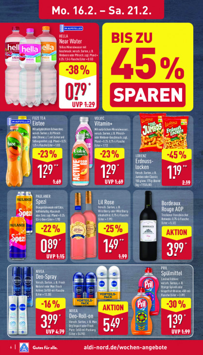 Bitte beachten Sie, dass dieser Text automatisch generiert wird und möglicherweise Fehler enthältMo. 16.2 Sa. 21.2 HELLA BIS ZU Near Water Stilles Mineralwasser mit st Geschmack:versch. Sorten,z. B. Ihella Himbeere oder Pfirsich; zzgl.Pfand= wi CARTE CEE] 3 8% 5% 79 Ne NA UVP +29 Zi FUZETEA VOLVIC 2, Eistee Vitamin+ AAA Mitaufgebrhtem Schwartee: Mit natürlichem Mineralwasser: versch. Sorten: z.B. Pfirsich & versch. Sorten, z B. Pfirsich- oder Zitrone; z T. mit Zucker und DO ute NEN ze, Sifungsmittl; zz. Pfand=025 Pfand ‚0,75-L-Flasche 42 > 4. fu \ 125-1-Flasche (Liter=1.03) [if LORENZ ED Erdnuss- locken 129 u 129 Versch. Sorten, z B. TÉ Jumbos oder Classic; ES 150 gbzw. 1759:Beutel kg =793/6.80) EE UE PAULANER Spezi | m NIT.) Bordeaux ‚Orangenlimonade mit Cola; : Versch. Sorten, 2. B. koffeinhaltig: Klassisch Wild Berry oder Wild Berry LOL] ‚oder Zero; zzgl. Pfand = 0.25; alkoholfrei; 0,75-L-Flasche Trockener französischer Ned Tc) {Liter = 1:99) Rotwein; 0,75-L-Flasche BORDEAUX (liter =5.32) fin R „KE Kad EU 89 2] 399 UVP+45 PRIL LUZ Ge Spülmittel Deo-Spray Fn Limited Edition; 4: er Versch. Sorten, z.B. Fresh | aks os versch. Sorten, z. B. B EEN ‚Active; 2x150-mi-Flasche Natural oder Men Fresh [M DN 1 c Pril DANSE No (Liter =13.30) [TS VORTEILS- TE LE LE Flas che (Liter ORTEILS- PACK alefd 16% À WAN 674 FE: Deo-Roll-on 6) 99 LEE A OE 39 Dry impact oder Fresh 49 © S= UVP 479 DR To _ SG UVP 4-99 {Liter= 54.90) aldi-nord.de/wochen-angebote sl A] Gutes für alle.
