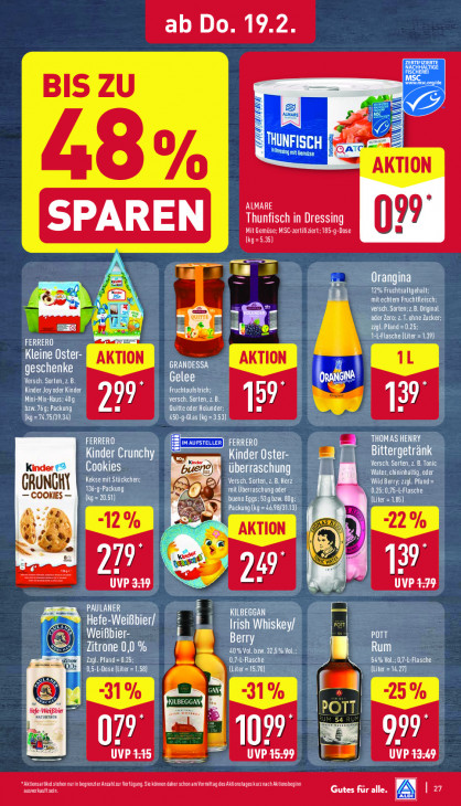 Bitte beachten Sie, dass dieser Text automatisch generiert wird und möglicherweise Fehler enthältab Do. 19.2. FEU Hans Line BIS ZU Ss eel Zi 5 THUNFISCH ATC = LL put u AKTION 8% ALMARE Thunfisch in Dressing Mit Gemüse; MSC-zertifiziert; 185-9-Dose 09 (kg=5.35) rn a Fe _Orangina #0 12% Fruchtsaftgehalt: 200 Vs; mit echtem Fruchtfleisch; iin. versch.Sorten;z.B. Original N gu QT Ce Maa Pfand = 0.25; FERRERO ma HAT Kleine Oster- AK TION geschenke GRANDESSA Versch. Sorten, z.B. Gelee bren Kinder Joy oder Kinder Fruchtaufstrich; Mini-Mix-Haus; 40 g versch. Sorten, z. B. bzw. Packung Dn Quitte oder Holunder; ETAT] 450-9-Glas (kg= 353) [ET LL ELLE LU tet) j Kinder Crunchy ESR Bittergetränk Cookies TE Versch. Sorten, z. B. Tonic überraschung Water, chininhaltig, oder CRUNCH Kekse mit Stückchen; © VETT _ m Wild Berry; zzgl. Pfand= — COOKIES — 136-g-Packung SAS REE LP 0, Flasche (g= 2051) PS TENT (liter = Packung (kg =46.98/3113) SE jh AKTION id À $ 3 2 2 UVP 349 NET: DEN zn ETES 7 KILBEGGAN — > AIT Irish Whiskey/ @ Weißbier- 1 une >, erry Rum Zitrone 0,0 = 0.25; 40% Vol. bzw. 32,5% Vol.; 7-L-Flasche mn Zico LE 2 0,7-LFlasche 54% Vol. CEE LE] (Liter= 15.70) (Liter m u EN 4 . EE POTT 54 I ik 99 99 —— UVP+45 UVP 45:99 ) LES * Akionsartikel stehen urinbegrenter Anzahlzur Verfügung. Sie Künnen aherschon an Vormittag des Akionstages kurz nach Akionsbeginn ausverkauftsei Gutes für alle. EE