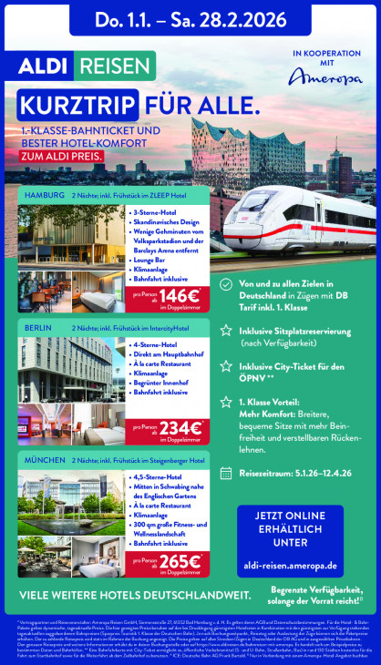 Bitte beachten Sie, dass dieser Text automatisch generiert wird und möglicherweise Fehler enthältSa. 28.2.2026 IN KOOPERATION MIT ALDI Amerspa 01:74:19 FÜR ALLE. 1.-KLASSE-BAHNTICKET UND vere BESTER HOTEL-KOMFORT Yu u Se ZUM ALDI PREIS [X je pi LITE ad FE Ir dat, AUS Lee gehen eli p) ne HAMBURG 2 lächte; inkl. Frühstück im ZLEEP Hotel 3-Sterne-Hotel m 21 ie Skandinavisches Design « Wenige Gehminuten vom — a l 1 Volksparkstadion und der [07 Pe Il Barclays Arena entfernt TL TES LIL: + Lounge Bar ae « Klimaanlage à 4 + Bahnfahrt inklusive \ Ip N 17 na N IN 146€ N Ce BERLIN 2 Nächte; inkl. Frühstück im IntercityHotel 3 = 1j + 4-Sterne-Hotel il] il WU. Direkt am Hauptbahnhof | « À Ia carte Restaurant a | fl ti « Klimaanlage Hin ER . Begrünter Innenhof EZ 5 + Bahnfahrt inklusive 7] | | | Te proPerson 234€ To we ka ken MÜNCHEN 2 Nächte; inkl. Frühstück im Steigenberger Hotel + 4,5-Sterne-Hotel + Mitten in Schwabing nahe des Englischen Gartens + À la carte Restaurant er di Ï « Klimaanlage JETZT ONLINE « 300 qm große Fitness- und u Wellnesslandschaft ERHÄLTLICH « Bahnfahrt inklusive UNTER Sn Ir sen [al al a u 1273 aldi-reisen.ameropa.de Eed mors Pakete rt dR Cr MES CA Re Do 2 mn er) FPT dh re sir ET En En me Fürdie Hotel je welles bun Ne ti NN on Reiseta der der Au ‘erhöhen. Der, PAS Leere ie Preis er en 2 RETE Crea Rei tu on a De = Een De er mer Te et ben Frank Barte Nur en: Br Kran nen ar.
