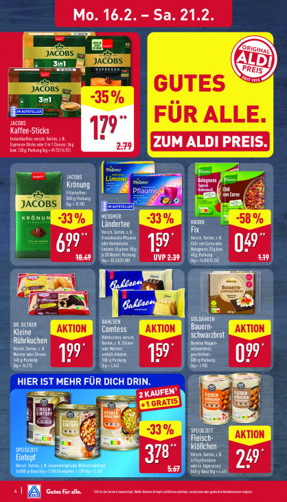 Bitte beachten Sie, dass dieser Text automatisch generiert wird und möglicherweise Fehler enthältMo. 16.2. - Sa. 21.2. TE) = 20 JACOBS B: sm | JACOB: — SPRESSO TE > y JACOBS GUTES | EZ ré 1 A 311 3 5 % Sem JACOBS FÜR ALLE. Kaffee-Sticks 79° Instantkaffee; versch. Sorten, z.B. Espresso-Sticks oder 3 in 1 Classic; 349 2.79 bzw. 120g; Packung kg = 49.72/14.92) — — ve JR de EN u 1 JACOBS MeBmer abs KE LU Filterkaffee; [Sohn] m Pflau De Chili EREN Fee con Carne (kg =13.98) Jae) fu JACOBS KRÔNUN MESSMER 0 DCR 3 3% LT -ÿ 8 Ländertee ix ++ Versch. Sorten, z.B. *+ vs KA Französische Pflaume Chili con Care oder Versch. Sorten, z. B. 99 59 49 je20 Beutel; Packung Limone: 45 g bzw. 50g: 40g: Packung EHER ET (Kg =35.33/31.80) WET} CAT —— an | \schwarzbrot), Bauern. CRT = ps ta En zen 9 ELU CRT] DR. OETKER Comtess Bauern- Kleine schwarzbrot Rührkuchen Fun Sorten, z. B. Zitrone LUEUR Eu Versch. Sorten, z. B. “oder Marmor: vollkornbrot: Dunkles Roggen- LUNETTES “enthält Alkohol; geschnitten; EO 17° Eee ein 17° El tn 02 (g= 420 [teren] MER) MEHR FÜR DICH DRIN. HIER IST © © HER 2 Ee Wi Ei 4 Der E N N N N 47 El == SATA fis 33% er EES AE Versch. Sorten, z. B. LES ‚oder in Jägersauce; 2 540-g-Dose (kg = 4.61) a CEST OT CESSE HELRERTENERTEIREPEEREREREIN FE EERRLER N