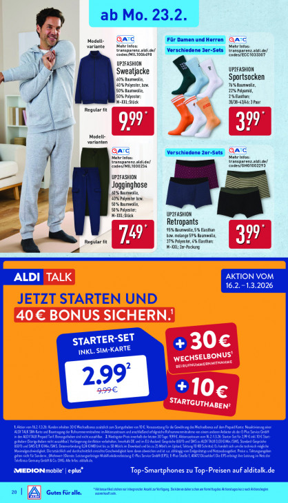 Bitte beachten Sie, dass dieser Text automatisch generiert wird und möglicherweise Fehler enthält3e Modell- QATG RATS) ì j variante Mehr Infos: Mehr Infos: transparenz.; Verschiedene 3er-Sets. transparenz.aldi.de/ rg codes/ECC1033307 UP2FASHION à À $ UP2FASHION Sweatjacke 60% Baumwolle, Sportsocken Ang F 40% Polyester, bzw. 76% Baumwolle, 50% Baumwolle, 22% Polyamid, 50% Polyester; 2% Elasthan; M-XXL:Stück 35/38-43/46; 3 Paar Regular fit | 8 I 900: B hy El Ë J Modell- varianten RATS 5 RATE _ Mehr Infos: Mehr Infos: transparenz.aldi.de/ transparenz.al le/ FE codes/MIL1000234 codes/GHG10022 UP2FASHION Jogginghose \ 60% Baumwolle, 40% Polyester bzw. | 50% Baumwolle, “ 50% Polyester; UP2FASHION M-XXL:Stück Retropants 95% Baumwolle, 5% Elasthan p| ban. melange 59% Baumwolle Ln 37% Polyester, 4% Elasthan: J MAAL: Zer-Packung Es 2 EN Regular fit 14 aA AKTION VOM ALDI 16.2. -1.3.2026 JETZT STARTEN UND STARTER-SET INKL. SIM-KARTE IN 1621326: Kunden. OEM sch tar ab n10 fürdi 7 W PE ien OA SIM-Karte und tra Ee LLU ira und anschie [m sam En inem and Anbiet En vb CETTE CT DS cahibar. 2. Nid DT ET au EIN) art FAT nnie ba) ung Ki EN LT) Er Tes PT Jun El ALDI QT Standard: EN 60 Da verbind mit Mbit im CT ED TRES TOTAL umdie hnisch mö he Ma NEN re on 27 on hen und ua.abhäng En Tore et. Pre ma 1 nicht Dienste un ee CEA CS Az Re 1,404 EpS br tur m Tel EN G.Ale Inf ie Top-Smartphones zu Top-Preisen auf alditalk.de