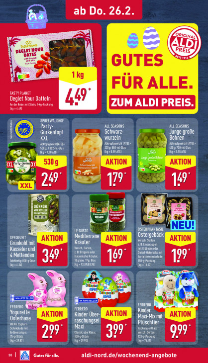 Bitte beachten Sie, dass dieser Text automatisch generiert wird und möglicherweise Fehler enthältN = ab Do. 26.2 &: Ne al En 2 = — DI DEGLET NOUR with branch MS. Hem unis Î N GUTES “= \ 1kg FÜR ALLE. LOUE Deglet Nour Datteln 49 ‚An der Rebe;mit Stein; 1-kg-Packung (kg =4.49) SPREEWALDHOF STE LS TUE Party- Gurkentopf Schwarz- IE Dot wurzeln a CNE Abtropfgewicht (ATG) = nm IC TENOIDES 530 g: 1.062-ml-Glas Or Le 320 9; 580-ml-Glas 4209; 720-mi-Glas {kg=4.70AT6) CEE (kg =3.55 AT6) rt © Ge) B ML ‘arty, Tj XX AKTION ae KEN Le > S = Lj 21 JE 49 79 y 49 pes: wir. SS 5 À CT alde IS IN ATP Sa ER & Ds Ge 8 \ mime = à DT M x il OSTERPHANTASIE EU ! LE GUSTO SPEISEZEIT Mediterrane Ostergebäck Grünkohl mit AKTION Kräuter KENT Versch. Sorten, mit Erdbeere oder ENEN Ei Kasseler und PANNE Dinkel-Osterkeks mit 4 Mettenden 49 EINES Er Zartbitterschokolade; Tafelfertig: 800-g-Dose LATE 19° 6 150-0-Packung 19 kg = 4.36) (kg =93.89/88.5) (TE) CS Co LS Le & ? ic) 2 BE] 24 2 ge NET D. NN ICE RL Ha) a! ad FERRERO . ES TIC AKTION TES Osterhase Maxi-Mix mi AKTION ELSE raschungsei Plüschtier ‚Schokolade mit Maxi Packung enthält Erdbeercrisps: Classic oder Rosa; LRU HT 2 OT 37 133-9-Packung TLR Mast) (kg=3990) CEA aldi-nord.de/wochenend-angebote ETM Gutes für alle.