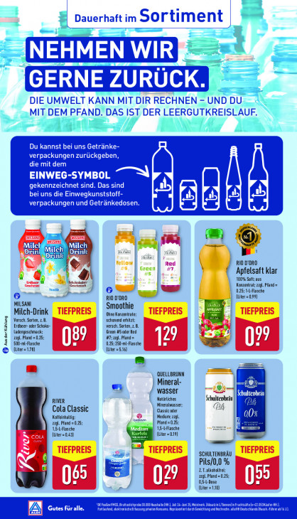 Bitte beachten Sie, dass dieser Text automatisch generiert wird und möglicherweise Fehler enthältIT En 1 onu! en Drink cm 2) dd Yellow RIO D'ORO #6 = res n Apfelsaft klar ed À : 100% Saft; aus Gesch Gesehmad: Konzent gl. Pfand 025 lasche RIO D'ORO u a (Lite 0.99) MILSANI Er Smoothie Milch-Drink Ohne Konzentrate; Versch. Sorten, z.B. schonend erhitzt; Erdbeer- oder Schoko- versch. Sorten, z.B. Ya Ladengeschmac Green #5 oder Red zag. Pfand #7; zaal. Pfand= Aus der Kühlung 500-ml-Flasche 0.25; 250 -Flasche (Liter = 1.78) (Liter =5.16) a = QUELLBRUNN Mineral- wasser à] Natürliches Schultenbräu RIVER Mineralwasser; Cola Classic Classic oder Bb Medium: zz. Kaffeinhaltig: Pfand=0.25; zag. Pfand =0.25; 1,5-L-Flasche Medium 15-LFlasche (Liter =0.63) (Liter =0.19) Sc el I SCHULTENBRÄU Pils/0,0 % LT.alkoholfrei; zagl.Pfand=0.25: 0? 0,5-L-Dose (Liter = 110)