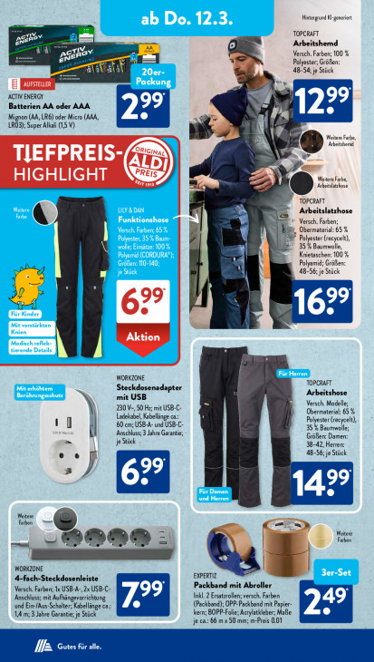 Bitte beachten Sie, dass dieser Text automatisch generiert wird und möglicherweise Fehler enthältHintergrund Kl-generiert mu a TOPCRAFT EN! Cal n= Arbeitshemd ‚TL Et OY- Versch. Farben; 100 % 4 pee Polyester; Größen: x ES & \ 48-54; je Stück E KEE as ACTIV ENERGY # FEI Batterien AA oder AAA 12 Mignon (AA, LR6) oder Micro (AAA, 7 LRO3); Super Alkali (1,5 V) LA Weitere Farbe, Arbeitshemd TIEFPREIS- NW er ALDI HIGHLIGHT Weitere Farbe, ri po) ZA ‚Arbeitslatzhose TOPCRAFT M Arbeitslatzhose # Versch. Farben; \ Obermaterial: 65 % | N° Polyester (recycelt), 35 % Baumwolle, | Knietaschen: 100 % | E Polyamid; Größen: 48-56; je Stück “) FEI 65° „16 WORKZONE TOPCRAFT Steckdosenadapter mit USB Arbeitshose Versch. Modelle; À 230 V-, 50 Hz; mit USB-C- Obermaterial: 65 % Ladekabel, Kabellänge ca: ı 60 cm; USB-A- und USB-C- Polyester (recycelt), Anschluss; 3 Jahre Garantie; 35.% Baumwolle; Größen: Damen: je Stück 38-42, Herren: 48-56; je Stück Ed Weitere Farben -@ Weitere Farben an: WORKZONE 4-fach-Steckdosenleiste EXPERTIZ : Packband mit Abroller Versch. Farben; 1x USB-A-, 2x USB-C- EI Anschluss; mit Aufhängevorrichtung Inkl. 2 Ersatzrollen; versch. Farben und Ein-/Aus-Schalter; Kabellänge ca.: Z, (Packband); OPP-Packband mit Papier- 1,4 m; 3 Jahre Garantie; je Stück kern; BOPP-Folie; Acrylatkleber; Maße je ca.: 66 m x 50 mm; m-Preis 0.01 EE: cuites für alle.