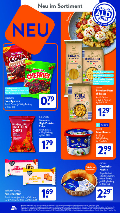 Bitte beachten Sie, dass dieser Text automatisch generiert wird und möglicherweise Fehler enthältNeu im Sortiment & £ A eır 193 1 4 x CUCINA nul en UINE — AL BRONZO = ple I TORTIGLIONI \) cer ss ne y AL BRONZO "4 \ EDA! Sweet Lanen 1 | 7 GB je ERRIES { Sd v— CUCINA =“ 2 Premium-Pasta Zr USILLI al Bronzo SWEETLAND Versch. Sorten; AL EROS) PA Fruchtgummi 79 Versch. Sorten; je 200-g-Packung; EE | kg-Preis 395 ALDI SPORTS 500g CPR ae PREMIUM HIGH High-Protein- MB vore PROTEIN Chips ARTEN un CUCINA CHIPS PR RS un Mini-Burrata Ee PTS 3x50g= ji a CT KL 32 5 kg-Preis 19.93 Ce) HJ RQ a7 12 = NY CUCINA „Fel NE Fn Wieder im Ciambella- KÜGH! LEIN Sortiment. Kuchen MARHOR 10 , Original italieni- scher Rührkuchen; NER CHN F1 À APRES 5 & ClAMgg, kg-Preis 5.73 MEINE KUCHEN WELT Feine Küchlein wi Versch. Sorten; je 4 Stück; je 140- bzw. 172-g-Packung; kg-Preis 12.07 bzw. 9.83 Sie können daher schon am Vomitt Wirbiten um Beachtung, dass diese Aktionsartikel im Unterschied zu unserem ständig vorhandenen Sortiment nur in bgrenter Anzahl zur Verfügung stehen ‚des ersten Aktionstageskur nach Aktionsbeginn ausverkauft sein. All Anikel ohne Dekoration. "Wir bitten um Beachtung, dass diese Saisonvare im D Re Ai ï in CNE ) venzter Anzahl zur Verf ow steht nd daher vorzeitig ausverkauft sein kann. Benjamin Blünchen/Bibi Blocksberg: © CREME TRE TS APN TEE ON 4 Mattel. MATTEL, HO! EELS and assodated trademarks and trade dress are owned by Mattel. ® and "* deignate US.