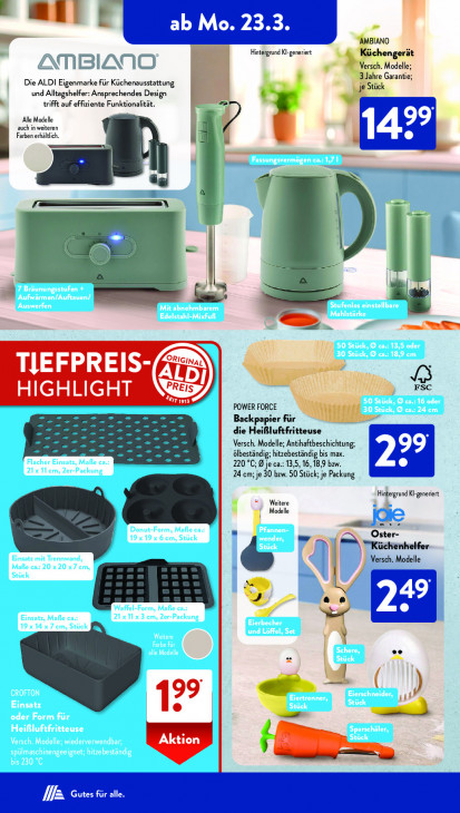 Bitte beachten Sie, dass dieser Text automatisch generiert wird und möglicherweise Fehler enthältKk NO Hintergrund Kl-generiert \ odelle; re Garantie; | Die ALDI Eigenmarke für Küchenausstattung und Alltagshelfer: Ansprechendes Design n trifft auf effiziente Funktionalität. ‚Alle Modelle ‚auch in weiteren Farben erhältlich. ee we er | | Nr N | ij TIEFPREIS- ORE DI VERI FSC HIGHLIGHT NI ut DETTES POWER FORCE Backpapier für = = die Heißluftfritteuse rn = Pr 5 = 2 Versch. Modelle; Antihaftbeschichtung; - 2 = = > = 5 = 5 ölbeständig; hitzebeständig bis max. 220 °C; B je ca: 13,5, 16, 18,9 bzw. 24 cm; je 30 bzw. 50 Stück; je Packung - Weitere Hintergrund Kl-generiert ! Modelle me Oster- F üchenhelfer. m za Versch. Modelle EEA .. . 99 ) en