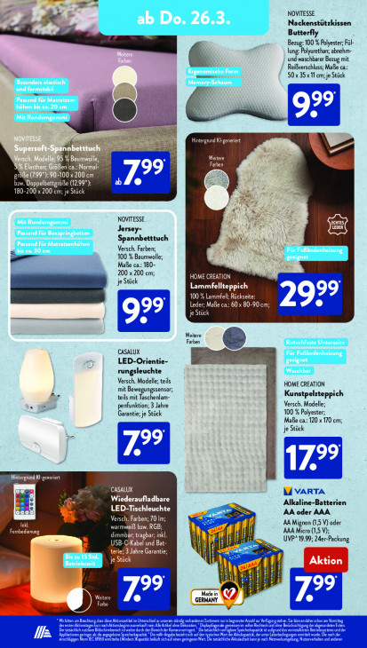 Bitte beachten Sie, dass dieser Text automatisch generiert wird und möglicherweise Fehler enthältD jt NOVITESSE » z Nackenstützkissen Butterfly Bezug: 100 % Polyester; Fl lung: Polyurethan; abnehm- und waschbarer Bezug mit Reißverschluss; Maße ca.: 50x 35x11 em; je Stück Hintergrund Kl-generiert BREI UNZL Weitere rôBen ca.: Normal- IE n N Rh (SIENNE A UE 180-200 x 200 cm; je Stück ER NOVITESSE Jersey- rd Spannbetttuch Versch. Farben; 7 100 % Baumwolle; IN En Maße ca.: 180- 200 x 200 cm; HOME CREATION je Stück Lammfellteppich 100 % Lammfell; Leder; Maße ca.: 60 x 80-90 cm; je Stück Weitere Farben CASALUX LED-Orientie- rungsleuchte Versch, Modelle; teils HOME CREATION ar mit Bewegungssensor; Kunstpelzteppich teils mit Taschenlam- “ penfunktion; 3 Jahre Versch. Modelle; Garantie; je Stück 100 % Polyester; Maße ca.: 120 x 170 cm; je Stück TT TU K Wiederaufladbare Alkaline-Batterien LED-Tischleuchte => AA oder AAA ID Versch. Farben; 70 Im; AA Mignon (1,5 V) oder warmweiß bzw. RGB; Fembedienung dimmbar, tragbar; inkl. j AAA Micro (1,5 V); USB-C-Kabel und Bat- É F UVP#19.99; 24er-Packung ES terie; 3 Jahre Garantie; WF ENT ES 2 ET | i Made in Fa GER) NY Kl
