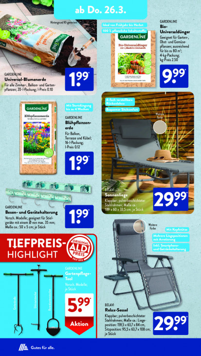 Bitte beachten Sie, dass dieser Text automatisch generiert wird und möglicherweise Fehler enthältirt GARDENLINE Hintergrund Kl-ge Bio- Nee 5 = = Universaldünger 484 LE ENT Geeignet für Garten-, 5 © Obst- und Gemüse- x Bio-Universaldünger 100% päanzliche Inhaltastae pflanzen; ausreichend für bis zu 80. m’; TR En 4ke-Packung; ot ee kg-Preis 2.50 dr Ti 2 an GARDENLINE ki Universal-Blumenerde iin I ür alle Zimmer-, Balkon- und Garten- pflanzen; 20-IPackung; I-Preis 0.10 CENTS LCR 5 Weitere, Blähpflan: zet a rde GARDENLINE Farbe Blühpflanzen- “2 erde 9 ul ®, À Für Balkon, | + Terrasse und Kübel; 16-I-Packung; I-Preis 0.12 er 2 12% u ra gr” TT AT FN zu. Ell Klappbar; pulverbeschichteten ee Stahlrahmen; Maße GARDENLINE ee 189 x 60 x 33,5 cm; je ck Besen- und Gerätehalterung Versch. Modelle; geeignet für Stiel- geräte mit einem D von max. 35 mm; Weitere Mae ca.: 50 x5 cm; je Stück Farbe x + TIEFPREIS- N Ben ÁLD| rn nnn Li & | HIGHLIGHT di SET 1913 5 L AN LA af È 99 BELAVI Relax-Sessel Klappbar; pulverbeschichteter Stahlrahmen; Maße ca.: Liege- position: 159,5 x 63,7 x 84 cm, Sitzposition: 95,5 x 63,7 x 108 cm; je Stück