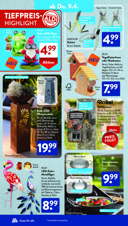 Bitte beachten Sie, dass dieser Text automatisch generiert wird und möglicherweise Fehler enthältBypass-Schere Feinschnitt-Schere er TIEFPREIS- ALDI À HIGHLIGHT Klare 7 N | 5, % \ GARDENLINE = ee Schere Versch. Modelle il 99 Weitere Farbe BELAVI Vogelfutterhaus (= oder Nistkasten Aktion Hi Versch. Farben; Maße ca. Vogelfutterhaus zum Auf- hängen: 22,512 x 26 cm, Nistkasten für Baum- oder Wandmontage: 15,5x13x 25,5 cm; je Stück Weiteres Modell = Weitere Farbe FSC Y ui BELAVT NUE Solar-LED- ee bis z Pflanzensäule Versch. Modelle; warm: weil Dr senso; 8 robuster Bodenan MaB Schale: @ 33,5 cm; Säu Aktion 19x19 x 60.cm; Gesamt À Hôhe: 72 cm; 3 Jahre Garantie; je Stück Pr pREIS Ln FOLGT 5 54 Weiteres Modell BBQ Eisenpfannen Weitere SNE Modelle BELAVI es an EE LED-Solar- N Metallfigur de! Versch. Modelle; Weiteres Modell im Zer-Set x e a für den Außenbereich; = = Lichtfarbe: warmweiß; IP44-Spritzwasserschutz; mit Dämmerungssensor; Ke C inkl. Batterie; 3 Jahre Garantie; je Stück N f z À Hintergrund Kl