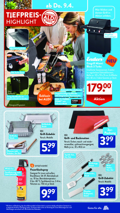 Bitte beachten Sie, dass dieser Text automatisch generiert wird und möglicherweise Fehler enthältMi Ÿ aM EN ca 2 I 5 L x % Js ETS TL 7) e RE ee HIGHLIGHT N A EL ® LS 3 LE 4) \ 17990 0 EE Exklusiv mm um bei ALDI TURBO à Hintergrund Kl-ge N BBQ Grill-Zubehör BBQ Versch. Modelle Grill- und Backmatten Versch. Farben; wasch- und wieder- (ef verwendbar; spülmaschinengeeignet; Maße je ca.: 33 x 40,6 cm à J GT \| 1 N N À B smartwares AN LA SF Feuerlöschspray Geeignet fürinnen und außen; À Brandklasse: 5A-5F; Betriebsdruck Be BBQ ca.: 10 bar; Betriebstemperatur: Grill-Zubehör 0 bis +50 °C; Sprühbereich ca.: 3-4 m; Versch. Modelle Fr Volumen ca. 750 ml; je Stück CH SB Kar