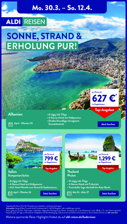 Bitte beachten Sie, dass dieser Text automatisch generiert wird und möglicherweise Fehler enthältMo. 30.3. - So. 12.4 ALDI SONNE, STRAND & Ei = 2 # ee. — ee nu: Se 4 er RSS ee hr Le ER va Er Se en En Ss & gen RE ZEE u 1 En 1 Be pro Person ab 627 € ne He: ee Ÿ = im Doppelzimmer Ae AZ 5 4 je, 2 Top-Angebot BR. Fa Le nh Kh ® we nm en = pro Person ab Ei ee pro Person ab a 799€ x 129€ ” Fr = BE im Doppehimmer Doppeltimmer ur Top-Angebot NAT Ke kuelle Pr Preisänderung vorbehalten. Limitiertes Kontingent. Veranstal rge & Meer Touristik GmbH, Andrées 27, Rengsdorf, aldi SOI Prei PE Änderungen vorbehalten. Begrenzt: Kontingent der Reisen. Arzahlung 2 hlung, Tage vor Rei DS ;eblich sind Reisebestätigung, AGB sowie die rechtlichen Informationen zur Pa Pen (mind. 25 € p. P) nach Rechnungserhalt, Einsicht auf aldi send Weitere spannende Reise-Highlights findest du auf al en.de/badereisen