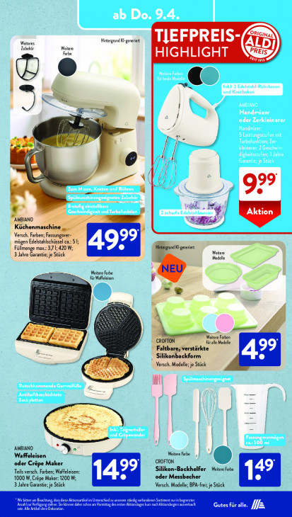 Bitte beachten Sie, dass dieser Text automatisch generiert wird und möglicherweise Fehler enthältWeiteres Hintergrund Kl-generiert TIEFPREIS- Zubehör Weitere Noy) Farbe HIGHLIGHT err 1913 € N se, 2 >+ pj € ÍN Fi 99 ne 4 re ESS. , ee MBIANO Vd” Küchenma | Versch. Farben; Fass mögen Edelstahlschüssel 99 Füllmenge max.: 3,7 |; 420 W. 49 nd Kl-generiert Weitere z 3 Jahre Garantie; je Stück Modelle LE \ für Waffeleisen Weitere Farbe + 2-, = Be, We ie Weitere Farben wi, füralle Modelle _ Faltb: rstärkte Silikon! kform Versch. Modelle; je Stück ) V9. 0 Wi a AMBIANO Waffeleisen Weitere Farbe CROFTON oder Crêpe Maker Silikon-Backhelfer Weitere Farbe Teils versch. Farben; Waffeleisen: 1000 W‚ Crêpe Maker: 1200 W; oder Messbecher 3 Jahre Garantie; je Stück Versch. Modelle; BPA-frei; je Stück Wir bitten um Beachtung, dass diese Aktionsarike im Unterschied zu unserem ständig vorhandenen Sortiment nurin begrenzter sein. Alle Artikel ohne Dekoration. Anzahl zur Verfügung stehen. Sie können daher schon am Vormittag des ersten Aktionstages kurz nach Aktionsbeginn ausverkauft Gutes für alle. fa