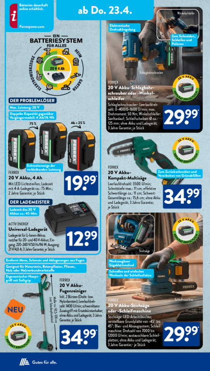 Bitte beachten Sie, dass dieser Text automatisch generiert wird und möglicherweise Fehler enthältKol Ee R —EN— LE = BATTERIESYSTEM an] FÜR ALLES Hu Fe ca % CCC + 5) de gbohrschrauber { '® £ Ga % % © 20 V Akku: ENE schraubér oder: inkel- schleifer m Schlagbohrschrauber: Leerlaufdreh- zahl: 0-400/0-1600 U/min; max. Drehmoment: 50 Nm; Winkelschleife Sanftanlauf; Schleifscheiben-® c: 75% Ab<25% 125 mm; ohne Akku und Ladegerä 3 Jahre Garantie; je Stück R „ pERREX nés in En | FERREX FERREX 20 V Akku- 20 V Akku, 4 Ah Kompakt-Multisäge Mit LED-Lichtstreifen; Ladezeit Leerlaufdrehzahl: 3500 U/min; le A mit 4-A-Ladegerät ca.: 75 Min; Schnitttiefe max.: 11 cm; effektive 2 Jahre Garantie; je Stück Schwertlänge ca.: 11 cm; Schwert- Gesamtlänge ca.: 15,6 cm; ohne Akku und Ladegerät; 3 Jahre Garantie; je Stück ACTIV ENERGY À frs m Universal-Ladegerät Ladegerät für i-lonen-Akkus; Ml V4 nutzbar für 20- und 40-V-Akkus; Ein- gang 220-240 VI50 Ha/96 Wi Ausgang: ZWVIAO A3 Jahre Garantie; je Stück Stichsäge uf LE ES FERREX > 20 V Akku- Fugenreiniger is | Inkl. 2 Bürsten (Draht- bzw. IS ELDER re jew Nylonborsten); Leerlaufdreh- 4 ahl: 1400 U/min; schwenkbarer usatzgriff mit Ersatzbürstenhalter; oder =Schleifmaschins ohne Akku und Ladegerät 3.lahre 5 Stichsäge: LED-Arbeitsleuchte; wormtungdogsspeL tw) Sp Garantie, je Stick verstellbare Grundplatte von -45° bis 45°; Bl TT 2 maschiı DEERD 12000 U/min; austauschbare platten; ohne Akku und Ladegerät hleif- a 3 Jahre Garantie;- je Stück