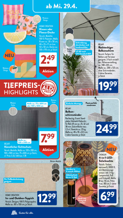 Bitte beachten Sie, dass dieser Text automatisch generiert wird und möglicherweise Fehler enthältrs x. wu © <> I Br En: BELAVI Weitere Rechteckiger Farben“ Balkonschirm Versch. Farben; für Balkon und Terrasse 49 N NZ 77 geeignet; 3-fach verstell- bar; Höhenverstellung ca.: 180-220 cm; Maße ca.: 200 x 125 cm; ohne Schirmständer; 3 Jahre Garantie; je Stück 0 \ | Ee ij IEEE. Wij TIEFPREIS- ALDI rg AJ Le + HIGHLIGHTS ar Passt perfekt zusammen BELAVI || Balkon- Il schirmständer Rechteckig; Granit-Stand- platte; Edelstahl-Halterohr; für Rohr-@ von ca.: 25, 32 und 38 mm; Schirmfläche max.: 2,5 m’; Gewicht ca: 25 kg; | Maße ca.: 45 x 10 x 22,5 cm; 3 Jahre Garantie; je Stück ı | | 1 | 7? Weitere Farben SA Sf Z 7 4 2 7 À CASALUX 1 N 4-in-1-LED- Weitere Modelle Solarleuchte Versch. Farben; warmweiß; 3000 K; mit Dämmerungs- A sensor; inkl. 3-tlg.- hy Lampenstiel, Fuß und Erdspieß; Maße: © @ ca.:16 cm, Hôhe max.: 80 cm; 3 Jahre r \ Garantie; je Stück 7 HOME CREATION = In- und Outdoor-Teppich Versch. Designs; 100 % Polypropylen; = 5 Erdspief nutzbar Maße ca.: 80 x 150 cm; je Stück EE: cuites für alle.