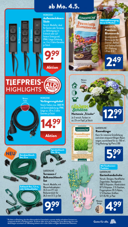 Bitte beachten Sie, dass dieser Text automatisch generiert wird und möglicherweise Fehler enthältab Mo. 4.5 £ GARDENLNE A Pr emium umenerde GARDI a la Blumenerdi EA TAT r AMEN Nite = a Timmer-, Balkon- u und Gartenpflanz 20-I-Packung; EE UD 99 3 49 Le Quant Weitere TIEFPREIS- erben ve ALDI 2 HIGHLIGHTS wl RETIE! = AN er n > N 5 = 2 LA à | 1 Hortensie „Tricolor“ Ed Je 3 versch. Farben im 12 ca. 23-cm-Topf; je Stück 99 GARDENLINE | F Rasendünger Rasendünger | Kann fürintensive Grünfärbung und einen strapazierfähigen Rasen ©): sorgen; ausreichend für ca.. 130 m’; 3-kg-Packung; kg-Preis 2.00 17 B M GARDENLINE KE GARDENLINE Terrassen-/ yn Gartenhandschuhe Balkonschlauch- ‚ Set Versch. Designs; Handfläche: Tiegenleder, Handgelenk: Versch. Modelle; mit 100 % Polyester, Handrücken: Wasserhahnadapter. a 97 % Polyester, 3 % Elasthan, 33,3 mm (1) mit Reduzierstück für él! Fingerspitzen: 95 % Nylon, 5 % Elasthan; Größen: 26,5 mm (1); je Set I SIT-XLND; je Paar AU Weiteres k Design # > & * Wir bitten um Beachtung, dass diese Aktionsartikel im Unterschied zu unserem ständig vorhandenen Sortiment nur Aktionsbeginn ausverkauft sein. Bekleidung teilweise nicht in allen Größen verfügbar. Alle Artikel ohne Dekoration. in begrenzter Anzahl zur Verfügung stehen. Sie können daher schon am Vortag des ersten Aktionstages kurz nach Gutes für alle. fa