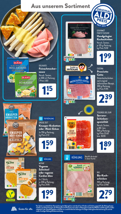 Bitte beachten Sie, dass dieser Text automatisch generiert wird und möglicherweise Fehler enthältAus unserem Sortiment ra Ek Se IT 1913 Ps In Ko Me GOURMET FINEST CUISINE ee Handgelegter Kochschinken N Versch. Sorten; 5 PE LL kg-Preis 15.92 El s° NG terre DELIKATO 3 ee Feinschmecker- PAY CUCINA sauce Prosciutto KOEN Cotto DELN 5 | je 300-ml-Packung Hinterkochschinken EE: Ie |-Preis 3.83 nach original LUN italienischem Rezept 200-g-Packung Ma PATES B =" re E LG NS | An TESOROS DELSUR | GC Serrano- CAE Schinken- SPEISE ZEIT spezialität is a ASE ] Knusper-Kroketten Versch. Sorten; oder -Rösti-Ecken je 80- bzw CA MNN GRAN NN KNUSPER ERS RÖSTI ECKEN kg-Preis 2.12 kg-Preis 23.63 AEK) =: e b vd dà “soll Betrifft alle Artikel in dieser Kachel. a PK FRI MYVAY Mans Veganes Den nan Schnitzel BIO Marlon oder veganes ; Bio-Koch- Noms Cordon bleu LEU Je 2 Stück; schinken Ne je 200-g-Packung À 100-g-Packung m kg-Preis 9.95 vs kg-Preis 2790 I EED m 34 = aktuell von 4 Stufen auf5 Stufen umgestellt. LEA us sE ee Du mende) El ae ME CES idem in Se are VA Gutes für alle. en zeichnung.
