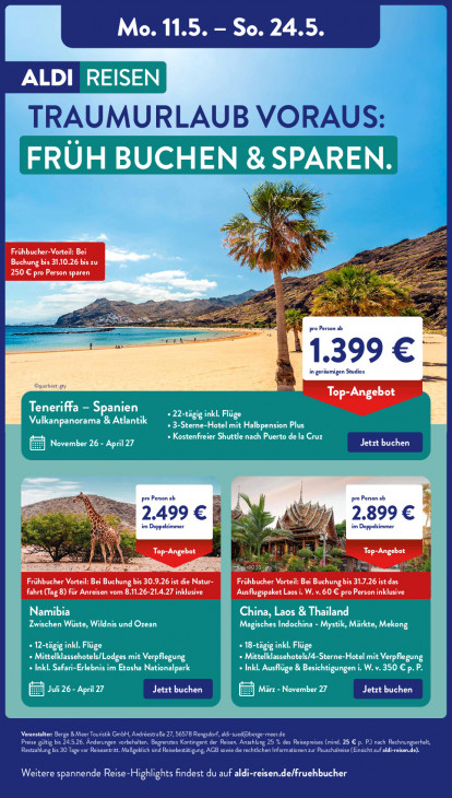 Bitte beachten Sie, dass dieser Text automatisch generiert wird und möglicherweise Fehler enthältLER LL RSA un So. 24.5. ALDI TRAUMURLAUB VORAUS: da | ie “le [A 25 Frühbucher-Vorteil: Bei a Buchung bis 3110.26 bis zu N. 7: 250 € pro Person sparen =; == eel mre Ce = LS À pro Person ab a as 1.399 € [ in geräumigen Studios a = querheet gh Top-Angebot pro Person ab pro Person ab 5 ll 4 2.499 € ‚2.899 € | im Doppekimmer im Doppekimmer u re BR je Dt Top-Angebot Lo & DEC os Fri LL Vort: Buchung bis 30 latur Frühbucher Vorteil: Buchung bis 31.7.26 ist das fahrt (Tag 8) für Anrei n vom 8, Ausflugspaket Laos i. W. v. 60 € pro Person inklusive Veranstalter Berge & Meer Touristik GmbH, Andröestraße 27, 56578 Rengsdorf, aldi-sued@@berge-meer.de Preise gültig bis 24.526, Ânderungen vorbehalten. Begrenztes EN VERA CERA MON Rechnungserhalt, Restzahlung bis 30 Tage vor Reiseantritt. Maßgeblich sind Reisebestätigung, AGB sowie die rechtlichen Informationen zur Pauschalreise (Einsicht auf aldi isen.de). Weitere spannende Reise-Highlights findest du auf aldi eisen.de/fruehbucher