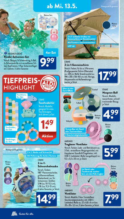 Bitte beachten Sie, dass dieser Text automatisch generiert wird und möglicherweise Fehler enthältsx ) Weitere Sets gp 2 + NAE Weitere ih Farbe ke NE 1 ( ji a nr 5 > O ‘coconur GROVE Ry Kinder-Schwimm-Set "© Versch, Designs; 1x Schwimmring, 1x Bl! CRANE 1x Schwimmbrille mit verstellbaren Sili 2-in-1-Sonnenschirm kon-Kopfriemen, 1 Paar Schwimmflügel ab 3 Jahren; 3 Jahre Garantie Versch. Farben; für bis zu 3 Personen; 9 aufgespannter Schim (Oberseite) ca.: 228 cm; Maße Strandmuschel ca, 194 x 205 x 136-163 cm; inkl. Heringe, 1 7? Abspannseile und Aufbewahrungs TIEFPREIS- tasche; je Stück ALDI HIGHLIGHT Rares “ootball CRANE Neopren-Ball Versch. Modelle: À. wasserfester, schnell a Fußball trocknender Bezug, je Stück lé 8 5 > 1 a ze Weiteres B Design Volleyball y ww 49 Weitere Farben fe $ bor 2 va UI > a N A I I ë u AMBIANO 8 1 | à ® Tragbarer Ventilator Versch. Farben; Lade- und Betriebszeit ca: Hintergrund Kl-generiert 3 Std; verstellbarer Neigungswinkel; mit klappbarem Standfuß /Tragehaken; inkl. USB-C-Ladekabel; Maße (ausgeklappt) ca: CRANE 9,3 x 5,5 x 20 cm; je Stück 5 Weitere 2-in-1- Farben 7 Schnorchelmaske Weitere Versch. Farben: Farben 180°-Panoramascheibe; pe. an. EN £ größenverstellbares )) Maskenband; nur für = Schwimmer; Größen; SIM (ca. 10-11,5 cm) Weitere L/XL (ca. 1,5-13 cm) Farben 5 L KL ms /à 3 Jahre Garantie; je Stück AMBIANO Ventilator ee Versch. Modelle; 3 bzw. 5 einstellbare EE Geschwindigkeitsstufen; inkl. USB-C- Ladekabel, laße ca.: 22 x 6,8 x 6 cm bzw. 20 x 28 x 3,2 cm; 3 Jahre Garantie; je Stück M Gutes für alle.