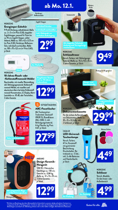 Bitte beachten Sie, dass dieser Text automatisch generiert wird und möglicherweise Fehler enthältWeitere Farbe À Heizkörper- Reflexionsfolie Innenansicht Zugluft-Stopper WORKZONE Energiespar-Zubehör P-Profil-Dichtung, selbstklebend, Maße \ ca.: 2x 5 m (m-Preis 0.30); doppelter Zugluftstopper, passend für Türen bis ca.95 cm; Zugluft-Stopper, selbst- klebend, Maße 4,5x0,75 cm (m-Preis 0.30); Heizkörper-Reflexions- Ne folie, individuell zuschneidbar, Maße ca.: 100 x 70 x 0,3 cm (m’-Preis 0.43); je Stick WORKZONE Schlüsseltresor + lersch. Farben; inkl. Befestigungs- \ aterial; Mafe ca.: 11,5 x 9,5 x 4 cm; pool 3 Jahre Garantie; je Stück Hintergrund Kl-generiert WORKZONE 10-Jahres-Rauch- oder -Kohlenstoffmonoxid-Melder Rauchmelder, mit visuller Warnmeldung, inkl, Befestigungsmaterial; Kohlenstoff- monoxid-Melder, mit visuellem und akustischem Alarm bei hoher Kohlenstoff- 7 monoxid-Konzentration, LC-Display, Alarm- Lautstärke ca.: 85 dB, oder Testschalter; 3 Jahre Garantie mm B smartwares ABC-Feuerlöscher Mit Trockenpulver; umentenkassette Treibmittel: Stickstoff Für die sichere Aufbewal (99,99 %); Brandklasse: von Dokumenten; [ER 434, 2338, C; inkl. 39 x 15 x 33,5 Befestigungsmaterial; 2 Schlüssel; je Sf 2 ed 6-kg-Flasche; -Preis BE 4.61, je Stück CASALUX Weitere Farben LED-Universal- Taschenlampe Versch. Farben; & 67 Im; Kunststoff € mit gummierter Beschichtung; = eitere Druckschalter; Be- m triebszeit ca.: 5 Std; inkl. 2x AA-Batterien AMBIANO und Handschlaufe; Design-Keramik- je Stück Heizgerät 1200 W; 2 Heizstufen; WORKZONE Kabellänge ca.:130 cm; Gewicht ca: ), 84 Schlösser Male ca.: 12 x 13 x 2 0 cm; Versch. Modelle; für den Innen- oder ] 3 Jahre Garantie; > ‚Außenbereich je Stück om (en) En