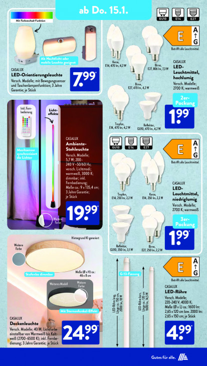 Bitte beachten Sie, dass dieser Text automatisch generiert wird und möglicherweise Fehler enthältER Mit Farbwechsel-Funktion E / Betrifft alle Leuchtmittel. | à A . i | 8 a 4 Kerze, CASALUX E14, 470 Im, 4,2W Birne, LED- CASALUX 4 E27, 806 Im, 73W Leuchtmittel, LED-Orientierungsleuchte hd 4 hochlumig Versch. Modelle; mit Bewegungssensor und Taschenlampenfunktion; 3 Jahre Bime, Versch. Modelle; Garantie; je Stück E27, 470 Im,42W 2700 K; warmweiß ü = nkLFem- Licht- bedienung effekte Tropfen, EM, 470 Im, 4,2W GUI0, 470 Im, 42W Reflektor, CASALUX Ambiente- E14 E27 Stehleuchte Versch. Modelle; JE Si vn Betrifft alle Leuchtmittel. 240 =50/60 Hz; ve RI warmw , 3000 K; | dimmbar; Fernbes ul CASALUX Maß, 9 x135,4 cm; 1 1 “4 LED- 3 Jahre Garantie; Tropfen, [Es Leuchtmittel, je Stück E14, 250 Im, 22W E14, 250 Im, 22W niedriglumig Versch. Modelle; 99 2700 K; warmweiß Weitere L Farbe A Hintergrund Kl-generiert 4 Weitere Reflektr, Birne, Farbe GUIO, 350 1m, 31W 627,250 Im,2,2W ) nn. ene —__ Maße (&xH) ca.: 46x8cm SE Betrifft alle Leuchtmittel. Weiteres Modell Weitere Farbe CASALUX LED-Röhre cm, | = Versch. Modelle; 220-240 V; 4000 K; 8 Im, : Malle (9 x L) ca.:1600 Im: LED-Rôhre lang, do 2 LED-Röhre kurz, = 2,65 x 120 cm bzw. 2000 Im CASALUX 2,65 x 150 cm; je Stück Deckenleuchte Versch. Modelle; 40.W; einstellbar von Warmweiß bis 9 eiß (2700-6500 K); inkl. Fernbe- dienung; 3 Jahre Garantie; je Stück m ee 5 Gutes für alle. fa