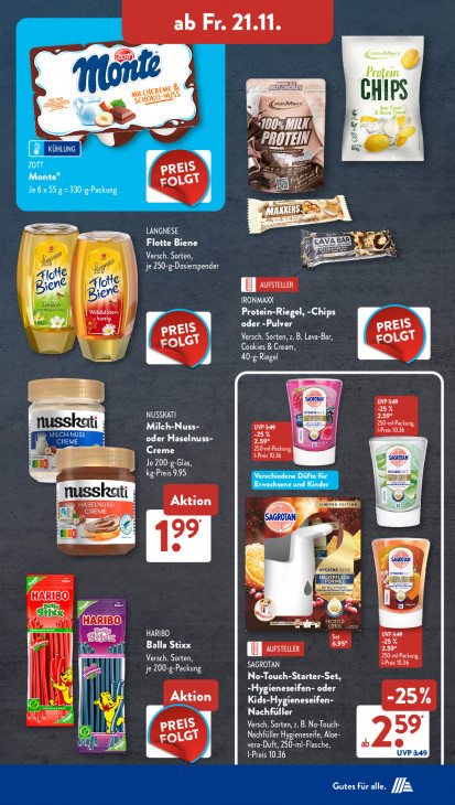 Bitte beachten Sie, dass dieser Text automatisch generiert wird und möglicherweise Fehler enthältab Fr. 21.11. @, Protein LE MLC AC ACS co © ENUSS (Gronmaxx CHIPS & buon. at PT F7 JS 4. PROTEIN DE: BA LIT LANGNESE Yu DEC Versch. Sorten, | PVT Ds e IK e €. AE IRONMAXX | N | LATE honig Protein-Riegel, -Chips at oder -Pulver 1140 NE 1) pREIS Versch. Sorten, z. B. Lava-Bar, FOL Cookies & Cream, FOLGT TETE ss AN IE 25% NUSSKATI PIS nusskat Milch-Nuss- IE] 350-ml-Packung, I-Prei 1036 MILCI oder Haselnuss- LED 25 % 1 Creme ROLE I-Preis 1036 SAGRTIA An IG Ben nu 5 Je 200-g-Glas, LA va kg-Preis 9,95 ne HASELNUS: Aktion U 3 ij je d AN P ” 2 FA (HARIBO) 1e Balla) En Le 5 C2 œ AR a un hal HARIBO Set UVP349 pee EE Balla Stixx 6.95 25 % Ces AUFSTELLER 2.59* OEL CH I-Preis 10.36 TE PV SAGROTAN | e No-Touch-Starter-Set, | N Aktion -Hygieneseifen- oder Kids-Hygieneseifen- -25% I Nachfüller EIS Versch. Sorten, z. B. No-Touch- fl PR GT Nachfüller Hygieneseife, Aloe- 59 [3 2 FOL vera-Duft, 250-ml-Flasche, 2 I-Preis 10.36 UVP 3:49 Gutes für alle. Ma