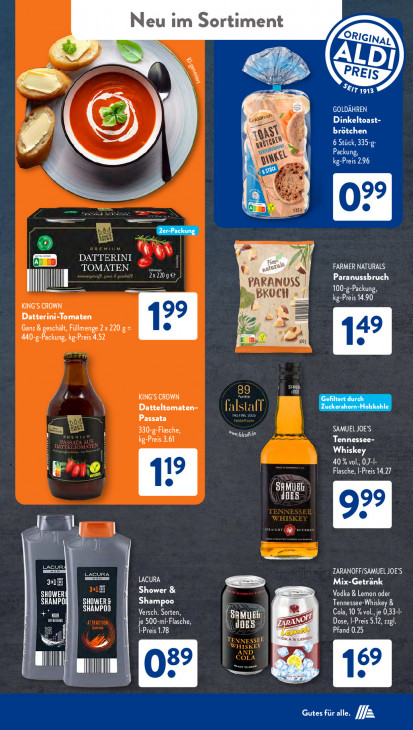 Bitte beachten Sie, dass dieser Text automatisch generiert wird und möglicherweise Fehler enthältNeu im Sortiment N NL 4 6 B IT 1913 (= =“ 4 GOLDÄHREN ce 4 Dinkeltoast- brôtchen AS EN ú io 6 Stück, 335-g Packung, PA gitte PAT SH 3350 7 FEA En 4 D : Ear | DATTERINI F le FARMER NATURALS TOMSTEN en RETIE Paranussbruch TE PARANSS | LUE „BRUCH » 1! PT) KING'S CROWN Datterini-Tomaten Ganz & geschält, Fülmenge 2x 220 g= a3 440-g-Packung, kg-Preis 4.52 D. 0; 89 ET ti PN KING'S CROWN m | Datteltomaten- ASE ke: ETC Passata B 330-g-Flasche, Mon Grade SAMUEL JOE’S DEN ES Tennessee- Whiskey EUR STINE 177 9 | Flasche, I-Preis 14.27 Lan i [Ei 8 u) Il CE I >) RE er 4 LACUR, 1 LACURA ZARANOFF/SAMUEL JOE'S DE LACURA Mix-Getränk Fi Shower & = Vodka & Lemon oder AU 8.711171] SHOW! DV) 5 j Shampoo Tennessee-Whiskey & aan NEO Em? Cola, 10 % vol., je 0,33-1 Cr PURES JOES Pea Dose, |-Preis 5.12, zl NC Pfand 0.25 TENNESSEE BKA ac LEMON a TE AND COLA 89 UI 0 e ETE