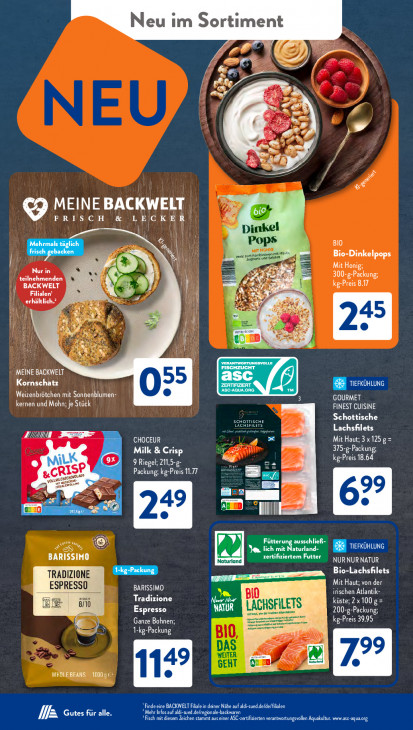 Bitte beachten Sie, dass dieser Text automatisch generiert wird und möglicherweise Fehler enthältNeu im Sortiment 0 le I > F: { ) a 7 de Er bi 24 Cu … we VPà % NT Tg a 9 FRISCH & ASE | Dinkel Pops BIO es Per rr HOM Bio-Dinkelpops U Nur in Mit Honig; teilnehmenden 300-g-Packung; D | BACKWELT CL ha | a Re A HR - | os AN | 1! CB) -% “X MEINE BACKWELT Kornschatz 55 ER Weizenbrötchen mit Sonnenblumen- GOURMET kernen und Mohn; je Stück FINEST CUISINE OMS LACHSFILES Schottische Lachsfilets US D CHOCEUR Mit Haut; 3 x 125 g= Milk & Crisp Ee 375-g-Packung; & kg-Preis 18.64 9 Riegel; 211,5-g- = vormers RISP Packung; kg-Preis 1.77 ge EL > =] Fütterui ausschließ- se À F LED ETES ERA BARISSIMO zertifiriertem Futter KIANA Naturland TRADIZIONE LS z Bio-Lachsfilets Mit Haut; von der ESPRESSO BARISSIMO irischen Atlantik- mur Tradizione BIO 8/10 Nd HSF küste; 2 x 100 g = Espresso IT NR (ENE kg-Preis 39.95 8 AT BIO, DAS WEITER Cd Ka 99 De a GERT © * à ! Finde eine BACKMWELT Fille in deiner Nähe auf aldi-sued.deldelfilalen EE: cuites für alle. ? Mehr Infos auf ldi-sued.de/regionale-backwaren DE AEN LP ETS STAAT